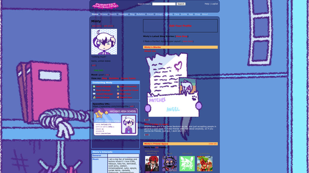 This layout was made with the aesthetic of Purrfect Apawcalypse in mind. The layout utilizes the duller color scheme of the game, features a student ID of Patches Ito from the game series, and even includes a note written by Patches that opens when pressed and held!